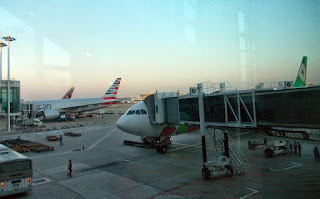An American Airlines flight to Dallas was stopping at gate 123 next to my flight. This flight was arriving 3 hours late, it has been hastily prepared for starting. In addition, a Qatar Airways Boeing 777-300ER plane was parked at gate 121. Both companies are members of One world, one of the world's three major airline alliances.